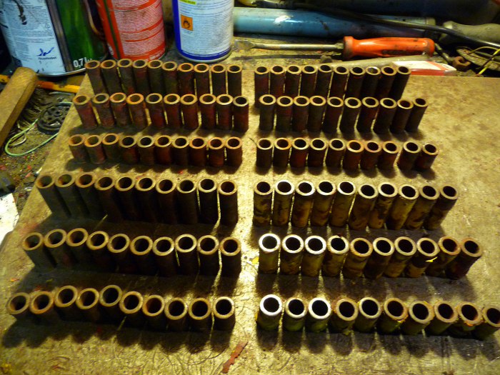 Części z blachy są od siebie dystansowane tulejkami. Od wewnątrz koła są najdłuższe, potem średnie i najkrótsze. Tu sprawdzaliśmy, czy są jednakowe na każdym kole i czy żadnej nie zgubiliśmy.