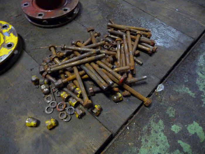 A tu śruby trzymające to wszystko razem. Większość śrub to już raczej niestety złom, podobnie wszystkie podkładki. Nakrętek powinno być po 10 na każde koło, ale mamy w sumie 29 sztuk... Poza tym każda jest inna, bo to ręczna robota. Piotra korci, żeby to tak zostawić, ale ja twierdzę, że każdy będzie mu wypominał to, że są nierówne :)