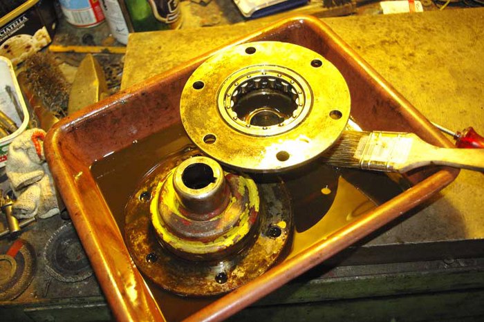 Wtedy dopiero można było zrobić coś konstruktywnego. Piotr umył łożyska piast tylnej osi pierwszej drezyny.