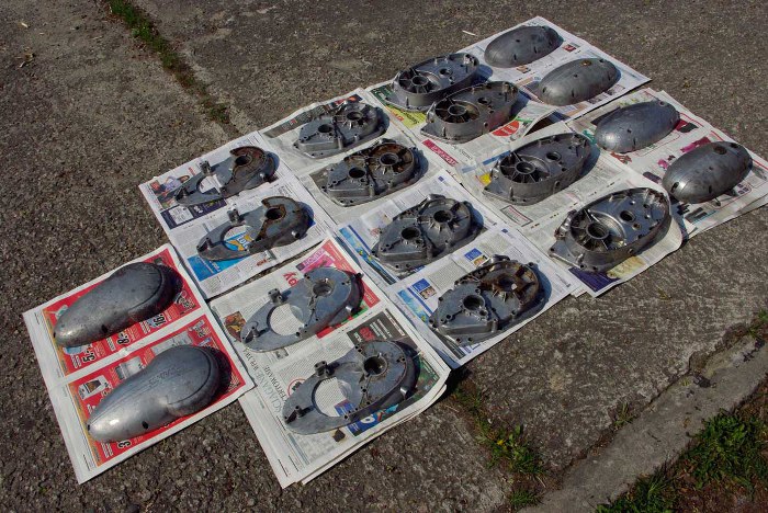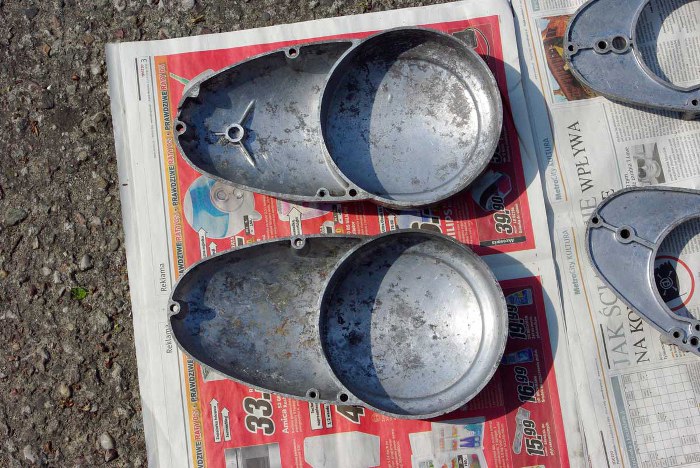 Nadeszła pora na mycie silników. Przy okazji można było sprawdzić która połówka silnika jest która. Niby każda do siebie pasuje, ale są drobne różnice wynikające zapewne ze zmian w trakcie produkcji. Na razie wymyte silniki czekają na postęp dalszych prac, leżą sobie spokojnie na półce :)