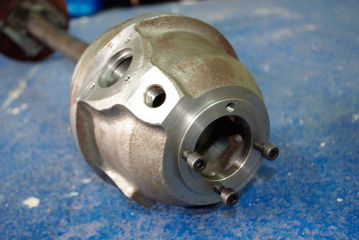A tu nowy odlew nawrotnika po pierwszej wizycie u tokarza. Później się okazało, że tokarz nieco się pomylił w zdejmowaniu wymiarów z oryginału i całość ma przesunięte wymiary o 1mm. Na szczęście nie spowodowało to bardzo istotnej zmiany w większości miejsc, ale ścianka z jednej strony ma 13mm zamiast 7mm, co jeszcze nie jest złe, ale z drugiej strony ścianka jest odpowiednio cieńsza i łożysko nawrotnika nie mieści się w niej w całości, tylko wystaje. To może być problem.