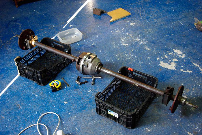 Jeszcze w zimę Piotr kupił na zapas osie od jakiegoś wózka szynowego. Kół "blaszaków" jest trochę za mało, bo jedno jest pęknięte, więc będzie próbował z tych coś zrobić, żeby pasowały, bo są prawie takie same, różnią się jedynie mocowaniem i nieco innymi otworami.