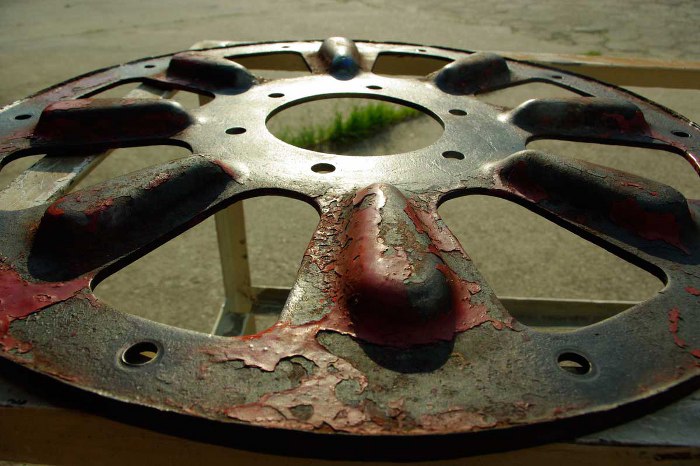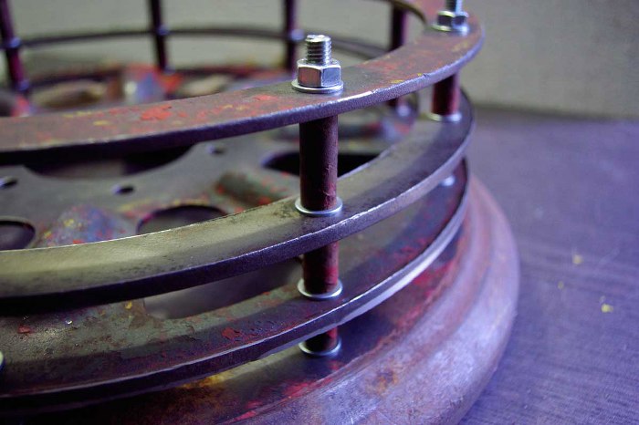 Kolejny temat i oczywiście kolejny problem. Koła. Talerze zostały wyprostowane u tokarza, więc można przyjąć, że chociaż to mamy z głowy, ale jak dobrze się przyjrzeć zdjęciu, to można zauważyć, że dookoła otworu na śruby skręcające poszczególne części koła widać odcisk tulejki dystansowej. Właśnie. To powoduje, że pomimo, że sam talerz jest prosty, to po skręceniu kół z tulejkami pojawia się lekkie bicie.