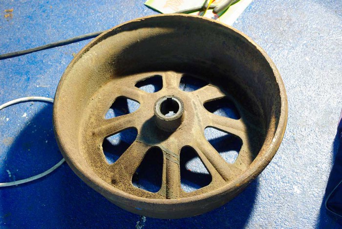 W każdym razie ściągnięte koło wygląda tak. W środku jeszcze została tulejka, która się trzyma na osi, ale ją się wytnie na tokarce.