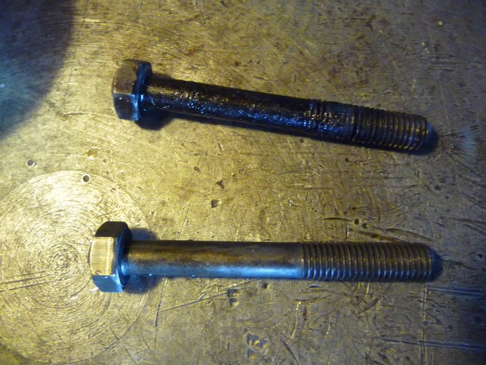 Po umyciu bloku Tomek się zmył, więc stopki wału i śruby musiałem już myć sam. Tu widać śrubę "PRZED" i "PO". Oprócz względów higienicznych (czego nie domyjesz będziesz miał w silniku) trzeba to domyć również po to, żeby dokręcić stopki wału z właściwym momentem. Dlatego gwint musi być czysty i posmarowany świeżym olejem.