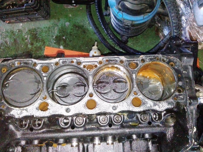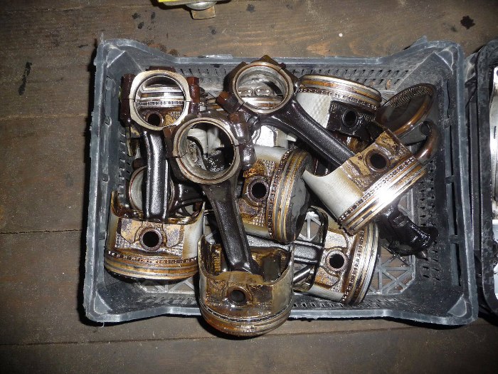 Tłoki wyjęte i odłożone na bok. I tak wkłądać będziemy już nowe, nadwymiarowe.