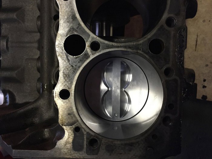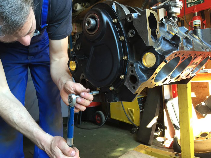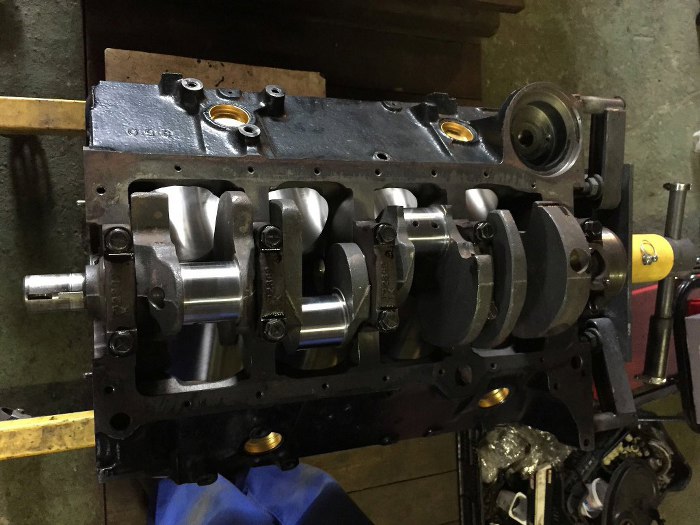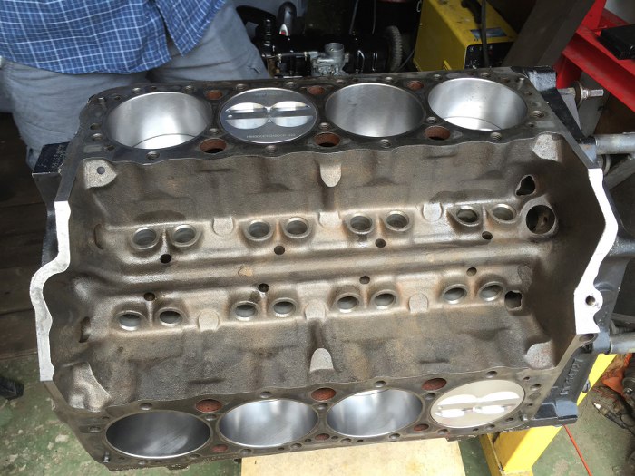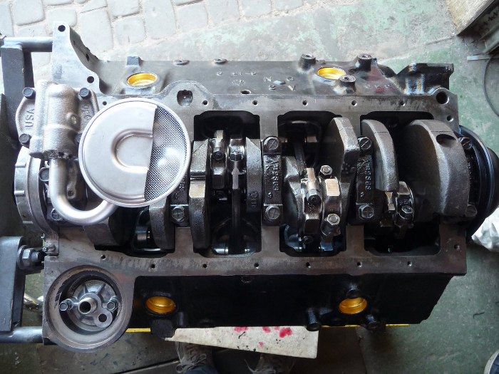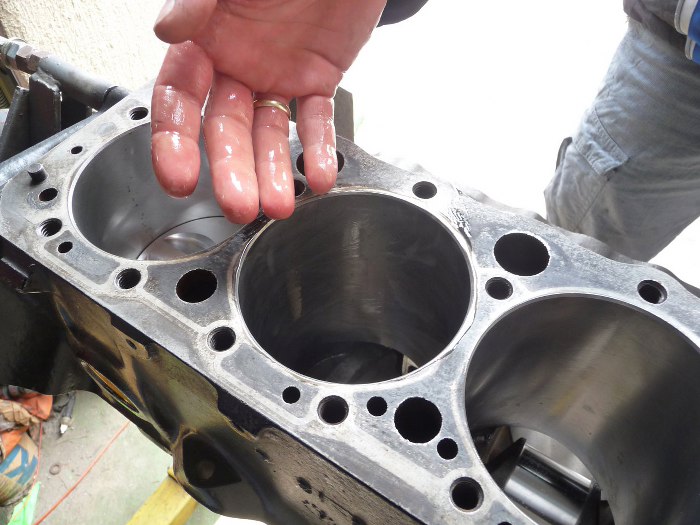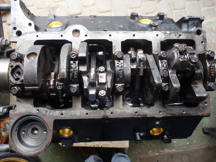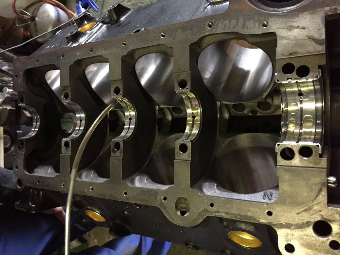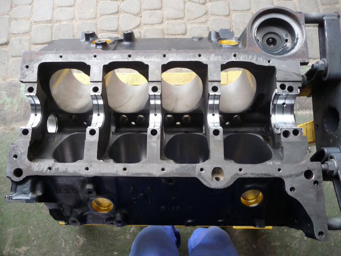 No dobra, silnik pomyty, przegwintowane otwory, można się wreszcie wziąć za coś ciekawszego, czyli składanie. Założyliśmy nowe panewki główne. Gładzie cylindrów jeszcze nie wyczyszczone do wkładania tłoków.