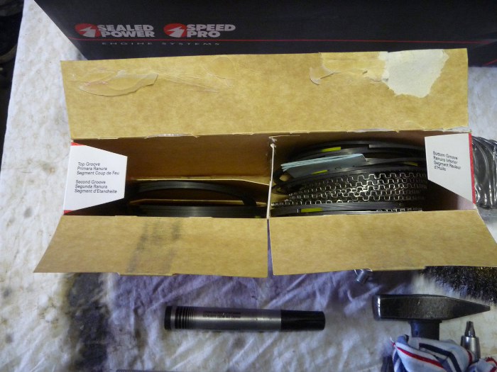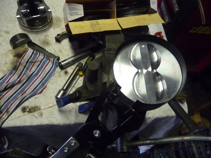 Pierścienie założone na tłok, teraz trzeba je ścisnąć do wkładania w cylinder.
