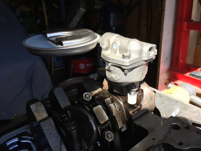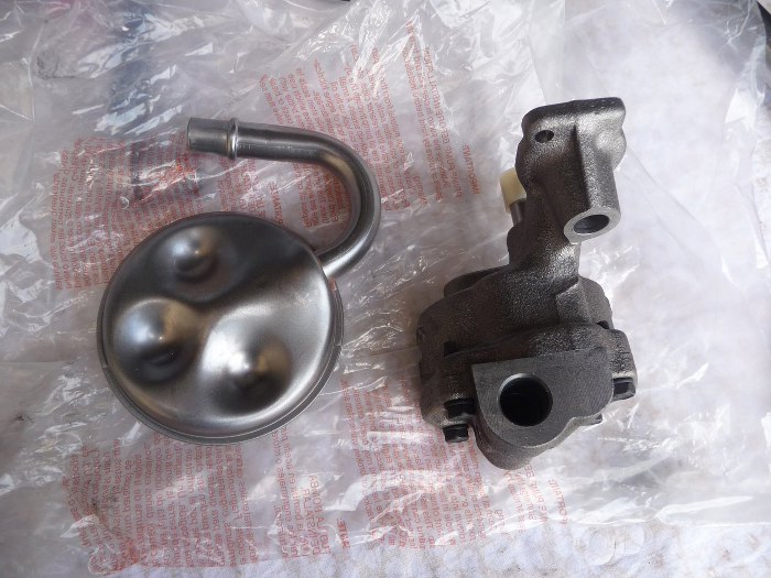 Teraz muszę przygotować nową pompę oleju. Small Block Chevroleta ma tu moim zdaniem jedną wadę - smok powinien być przykręcany, co wyeliminowałoby możliwość jego złego założenia. Jest natomiast wciskany w korpus pompy. Dzięki temu co prawda można dokładnie ustawić jego wysokość nad dnem miski olejowej, ale samo wciskanie jest dość trudne.
