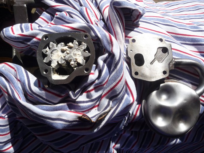 Po pospawaniu przykręciłem już pompę na gotowo. Teraz zdjąłem pokrywę pompy i nasmarowałem porządnie smarem montażowym. Dzięki temu tuż po pierwszym uruchomieniu silnika pompa łatwiej zassie olej z miski olejowej.