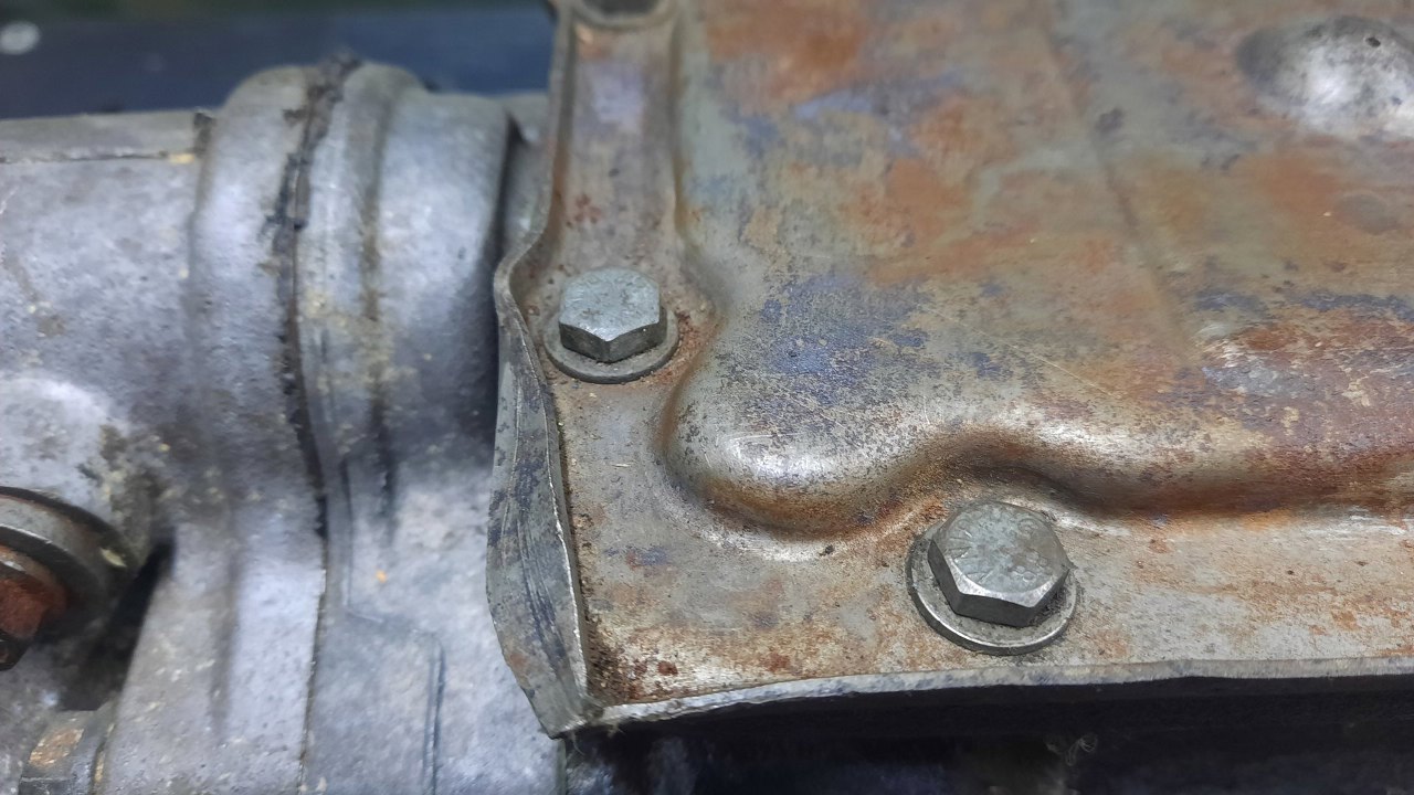 Odkręciłem śruby trzymające ogon skrzyni do korpusu. Brakuje blaszki z numerem części, która zawsze jest pod jedną z dolnych śrub.