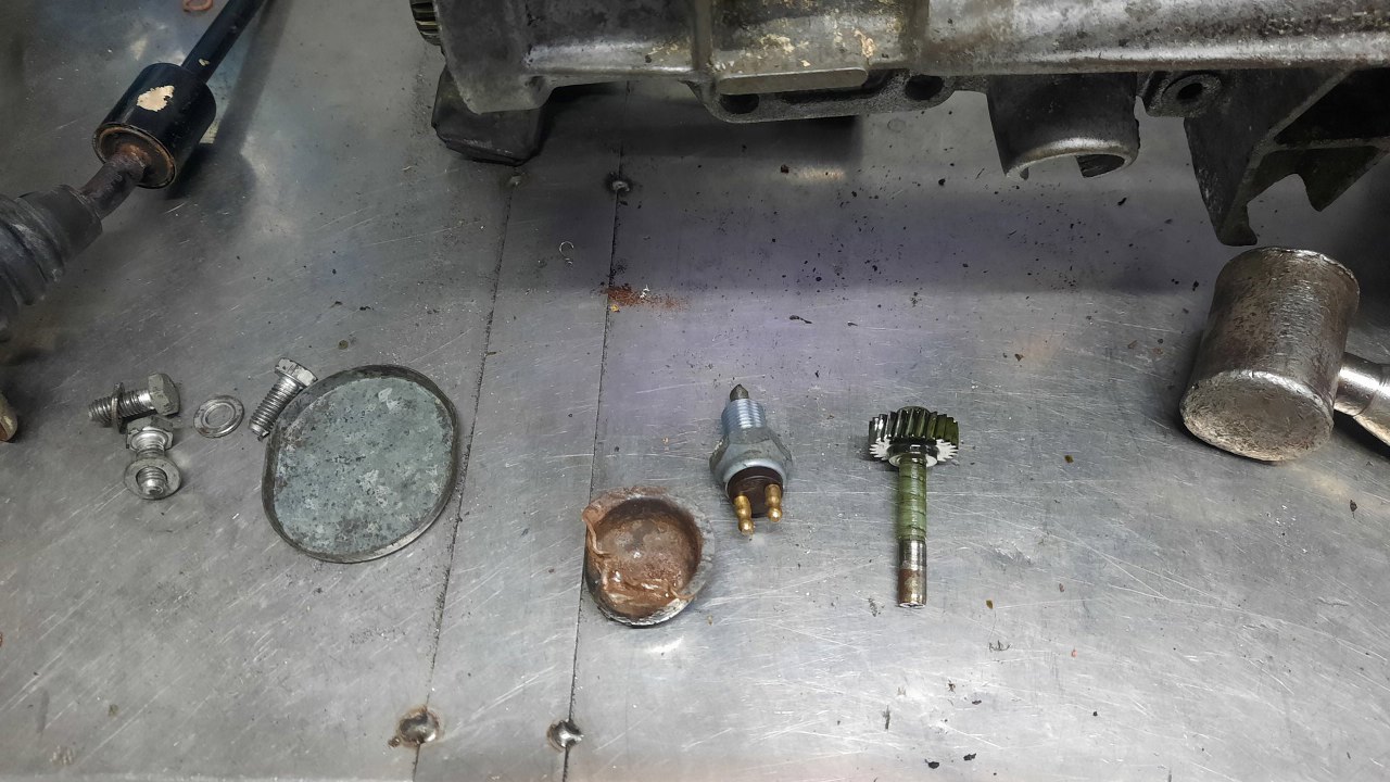 Odkręciłem czujnik biegu wstecznego, a następnie zmasakrowałem zaślepkę napędu prędkościomierza i wyjąłem zębatkę. Zaślepki inaczej się wyjąć zazwyczaj nie udaje :). Na tym zdjęciu widać jeszcze (ledwo), że ogon skrzyni jest ukruszony w miejscu mocowania poduszki skrzyni. Potem cały ogon zmieniłem na inny.