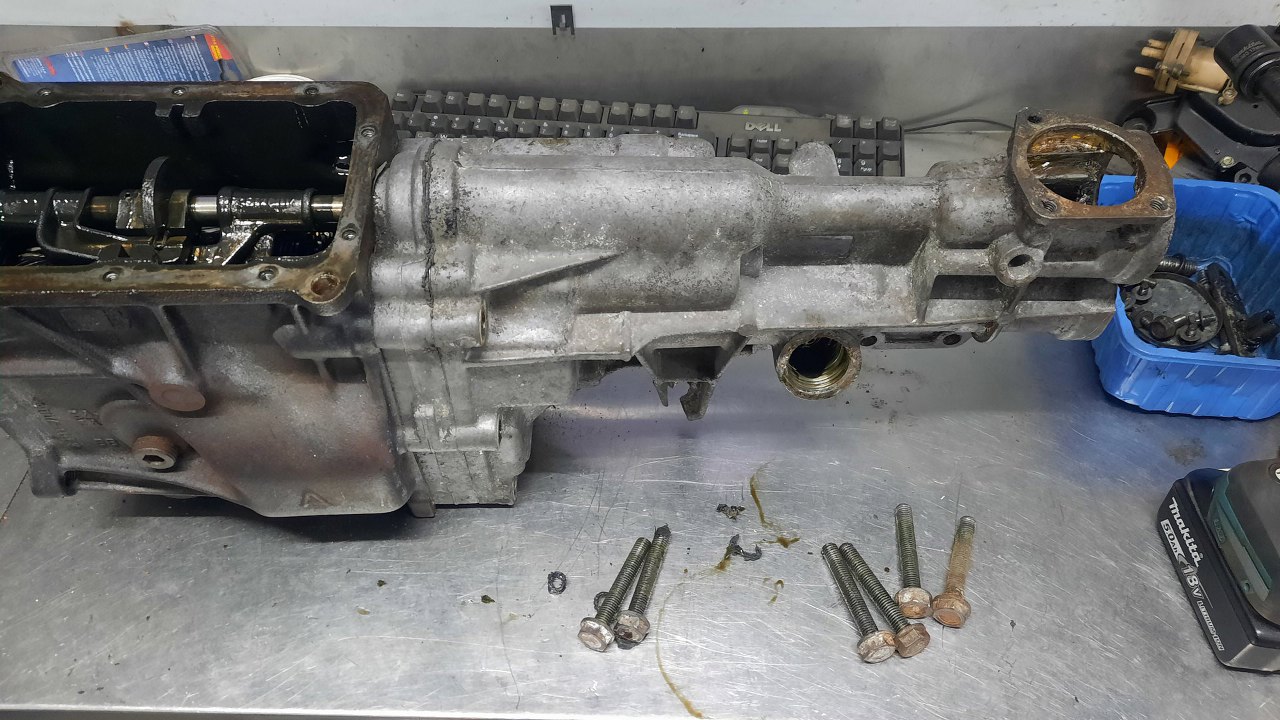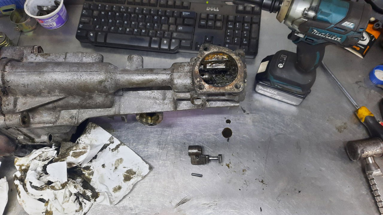 Potem zacząłem rozkładać skrzynię. Zacząłem od odkręcenia dźwigni zmiany biegów i wybicia zaślepki z tyłu.