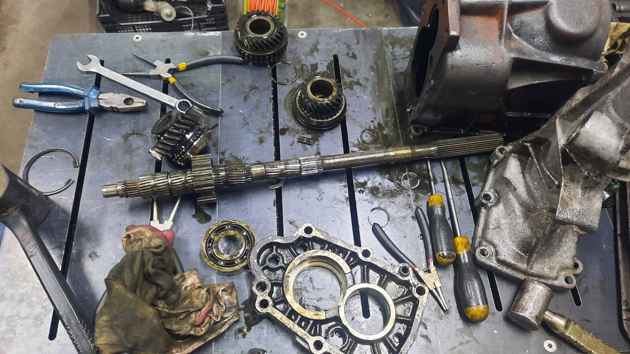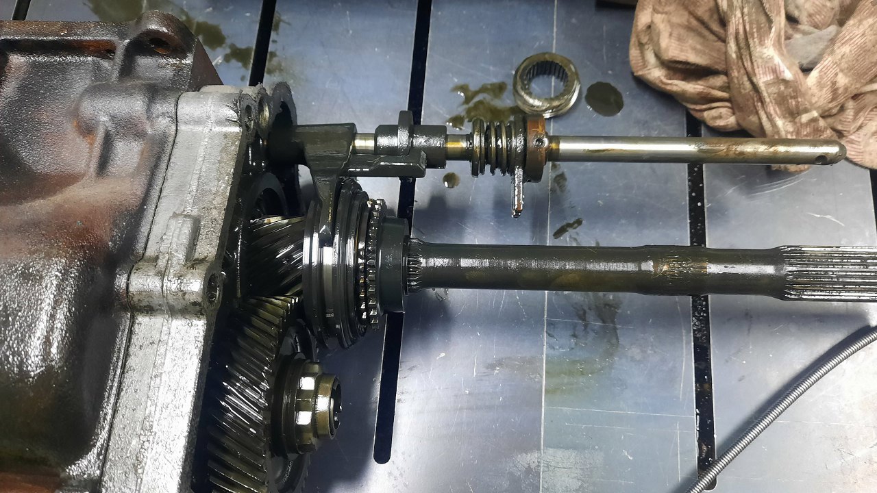 Z wałka wyjściowego zsunąłem mechanizm piątego biegu. Została jeszcze jego druga część, czyli napędzające koło zębate, widoczne na zdjęciu przykręcone nakrętką.