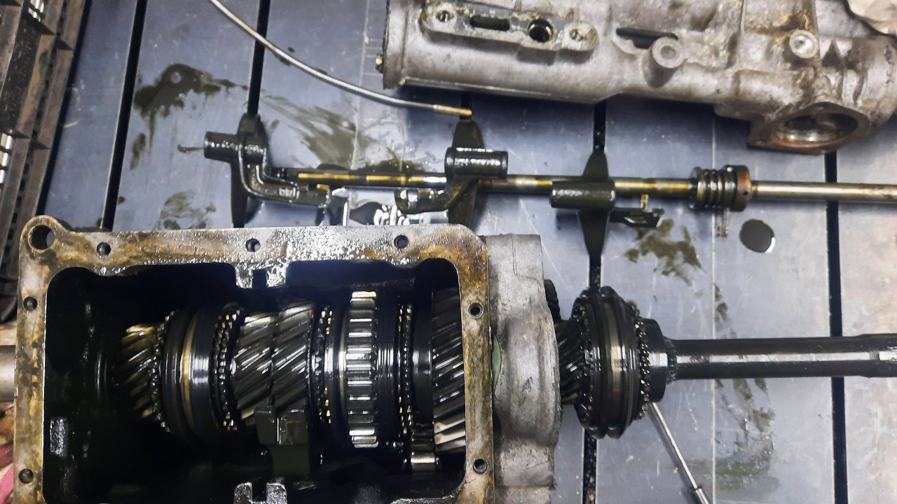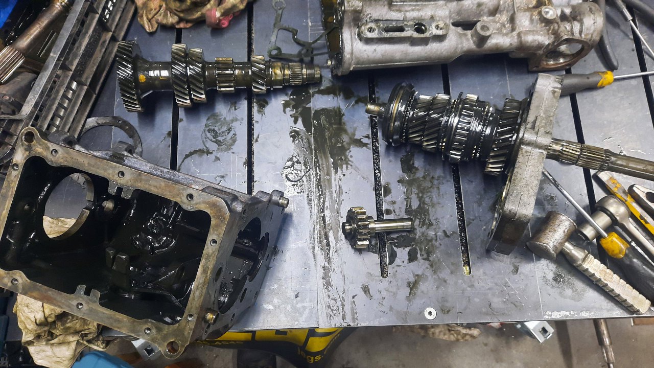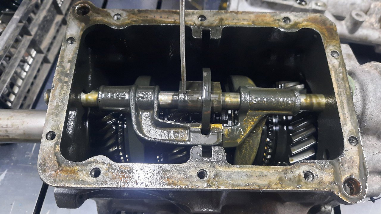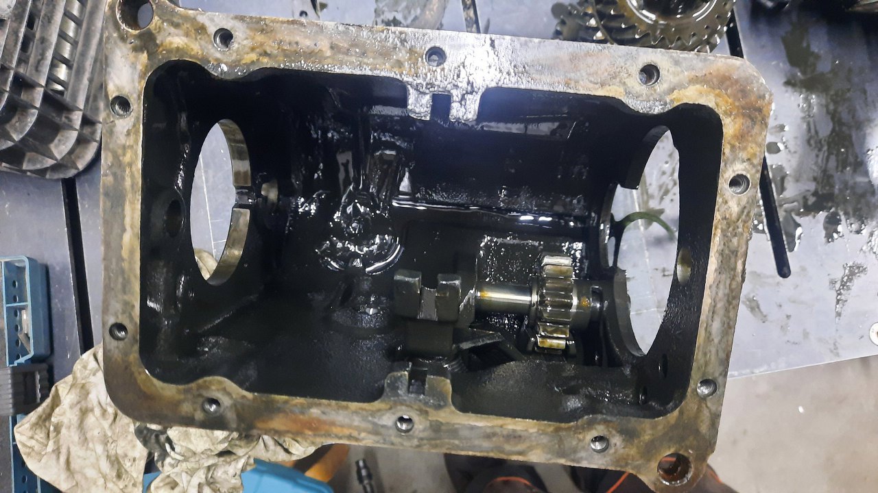 W obudowie jest jeszcze kółko wstecznego biegu z mechanizmem jego przesuwania. I całkiem sporo szlamu olejowego.