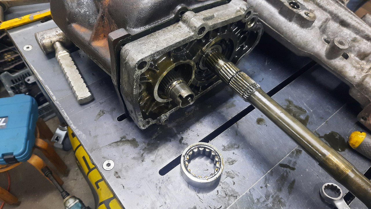 Na początek przejrzałem ją z wierzchu i znalazłem kilka wad... Ryjek skrzyni, po którym przesuwa się łożysko sprzęgła był wyrobiony. To pozyskałem używane z innej skrzyni.