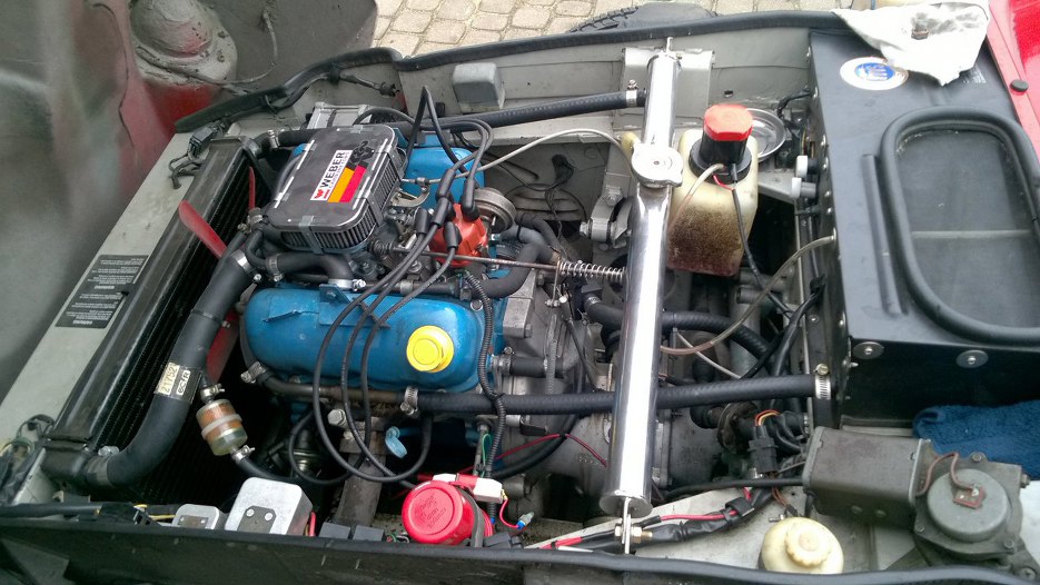 Przyjechał do mnie z wizytą kolejny Saab Sonett. Ma silnik 1.5 V4, podobno dłubnięty, po remoncie. W/g właściciela, Huberta, jego osiągi nie różnią się znacząco od silnika bez modyfikacji, który ma w innym swoim Saabie. To jest też powód wizyty - miałem przy okazji wymiany oleju pomóc się zastanowić co i jak.