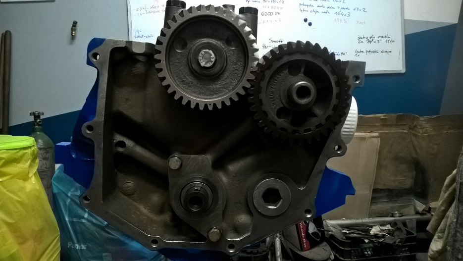 I wał korbowy na miejscu. Założyłem też koło zębate wałka wyrównoważającego.