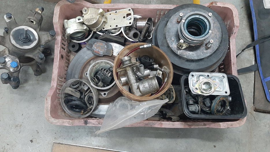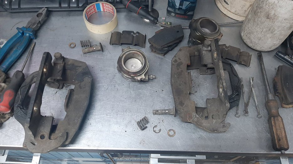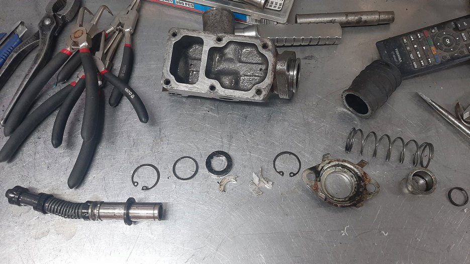 Pompa hamulcowa jest przerąbana do rozkładania. Pierścienie Segera w niedostępnych miejscach, niektóre podkładki trzeba wyrwać siłą z miejsca... Plus jest taki, że korpus jest w dobrym stanie i nie ma wżerów. Minus też jest, trzpień jest porysowany i się nie nadaje do użycia. Mam gdzieś zachomikowany z innej pompy taki sam, gdzie korpus był zardzewiały, może się do czegoś nadaje. Inaczej będzie problem...