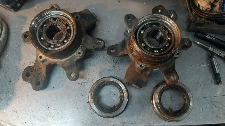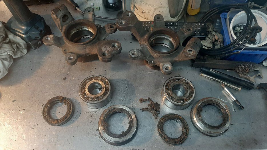 Potem wycisnąłem łożyska na prasie. Czas najwyższy na przegląd, bo te farfocle pomiędzy łożyskami to smar był. Ma konsystencję i lepkość trocin.