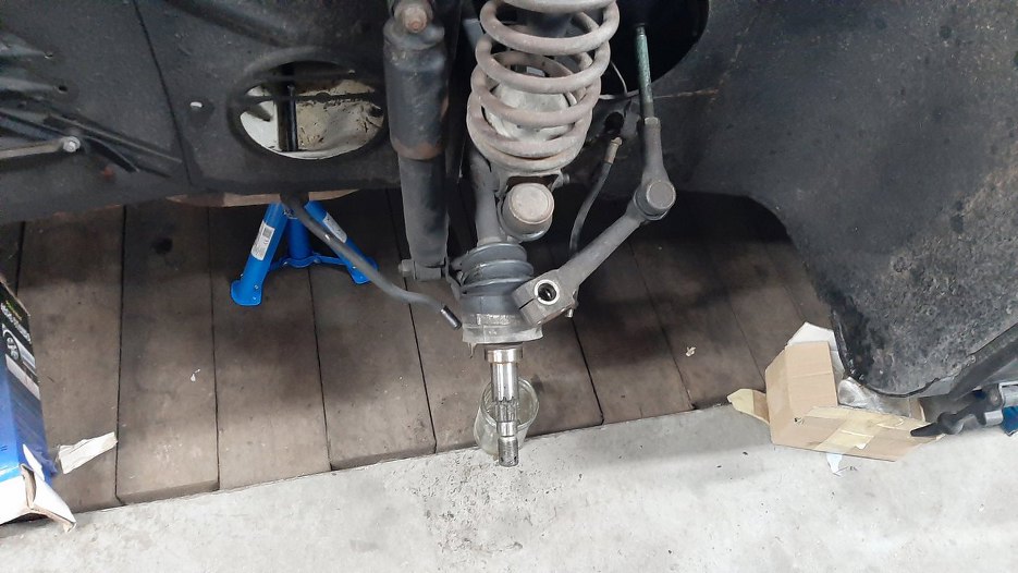 Odkręciłem tarczę osłaniającą hamulce, ramię zwrotnicy (u góry) i sworzeń dolny.