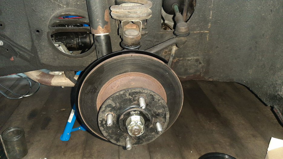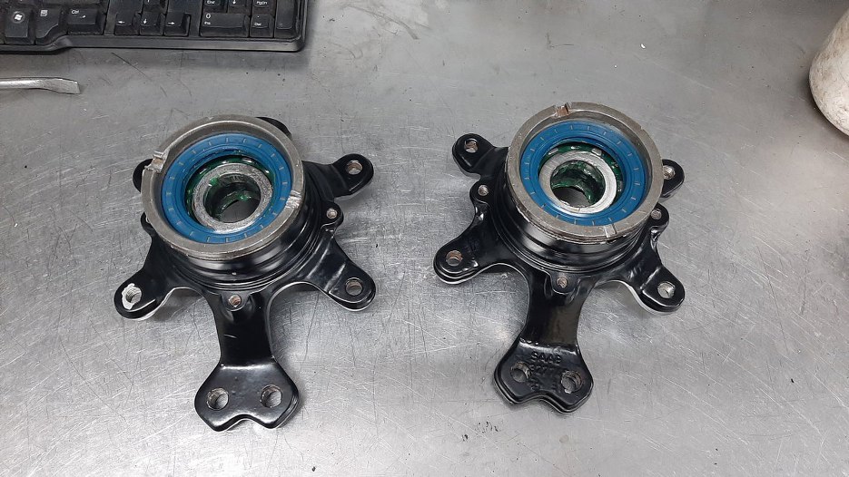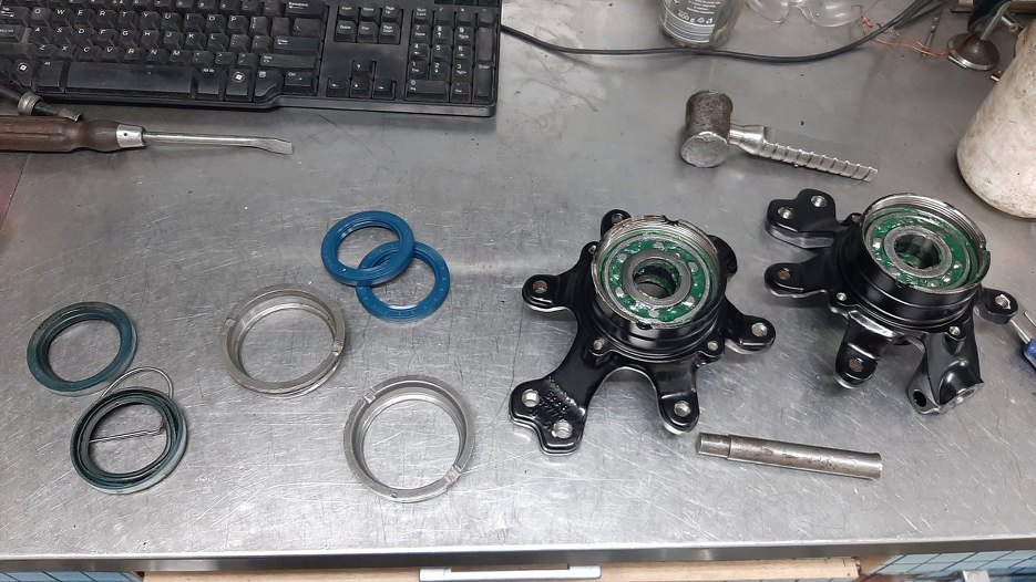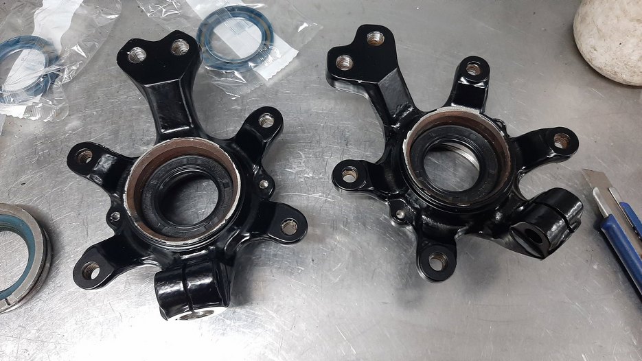 Łożyska wyczyściłem ze starego smaru (o konsystencji trocin) i napakowałem do nich nowego. Łożyska wcisnąłem do zwrotnic. Stare simmeringi wyjąłem z pierścieni zabezpieczających łożyska.