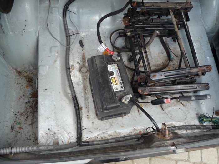 W bagażniku wylądował akumulator, podłączony przewodami od BMW. Są fajne, bo nowe i tanie.