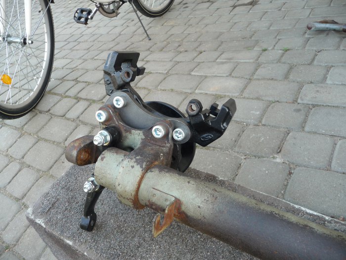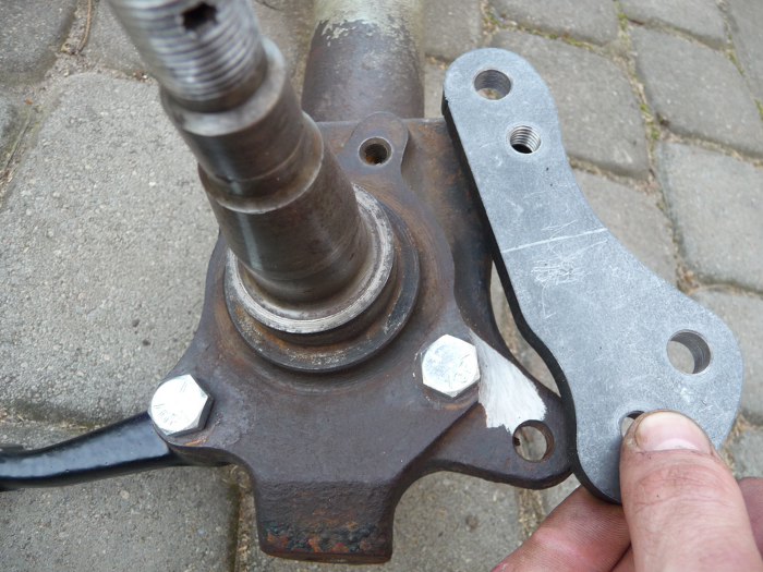 Tu widać przykręcone do kolumny (od lewej): ramię zwrotnicy, bracket, a na końcu jarzmo zacisku pływającego z Sierry.