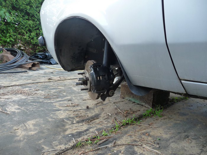 Przykręcane są w te same otwory, co zwykłe zaciski od Capri (przypominam, że kolumny zawieszenia są od Capri), piasta jest również od Capri, ale ze stoczoną częścią, gdzie przykręca się oryginalną tarczę hamulcową (w tym miejscu nie ma już po przeróbce miejsca, bo jest tam jarzmo i zacisk hamulcowy). W piaście są również wymienione szpilki na dłuższe, ponieważ nowa tarcza hamulcowa (od Sierry z ABS - 260x24mm, wentylowana) jest zakładana na piastę, a nie pod nią.