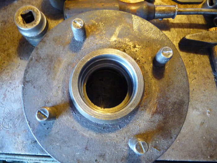 Odkręcone śruby mocujące tarczę hamulcową. Teraz trzeba delikatnie wybić z tarczy piastę młotkiem gumowym. Aż by się chciało wziąć zwykłego młota, tak to opornie idzie, ale wtedy pokaleczy się piastę, więc męczę się gumowym. Prasy na tyle dużej nie mam :)
