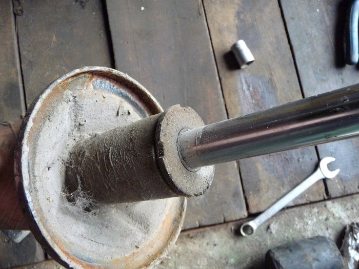 W kolumnie zostały już tylko amortyzatory. Żeby je wyjąć trzeba odkręcić tą dużą nakrętkę.
