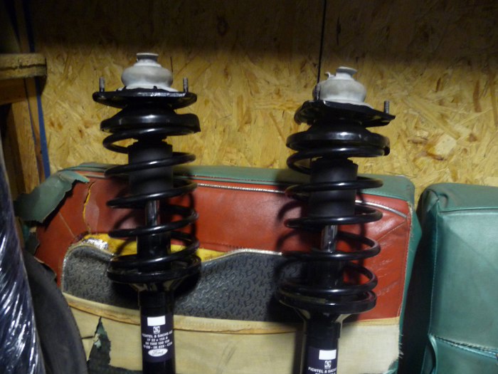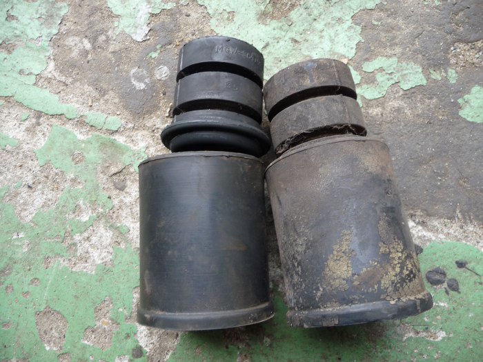 Te gumy nie tylko osłaniają tłoczysko amortyzatora, ale i spełniają funkcję odboju. Fabryczne gumy pomijając zabrudzenia były w świetnym stanie, więc je wyczyściłem (po lewej) i założyłem. Znowu zabawa ze ściskami do sprężyn.