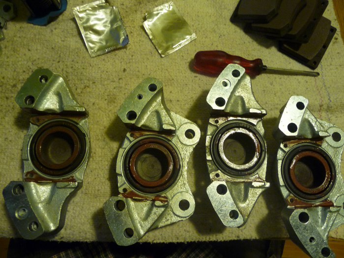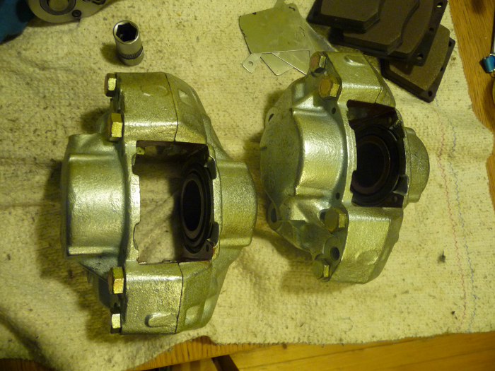 Po doczyszczeniu rowków, włożeniu uszczelek i posmarowaniu całego wnętrza smarem do zacisków (nie wiadomo, kiedy to będzie zalane płynem hamulcowym) można włożyć tłoczki.