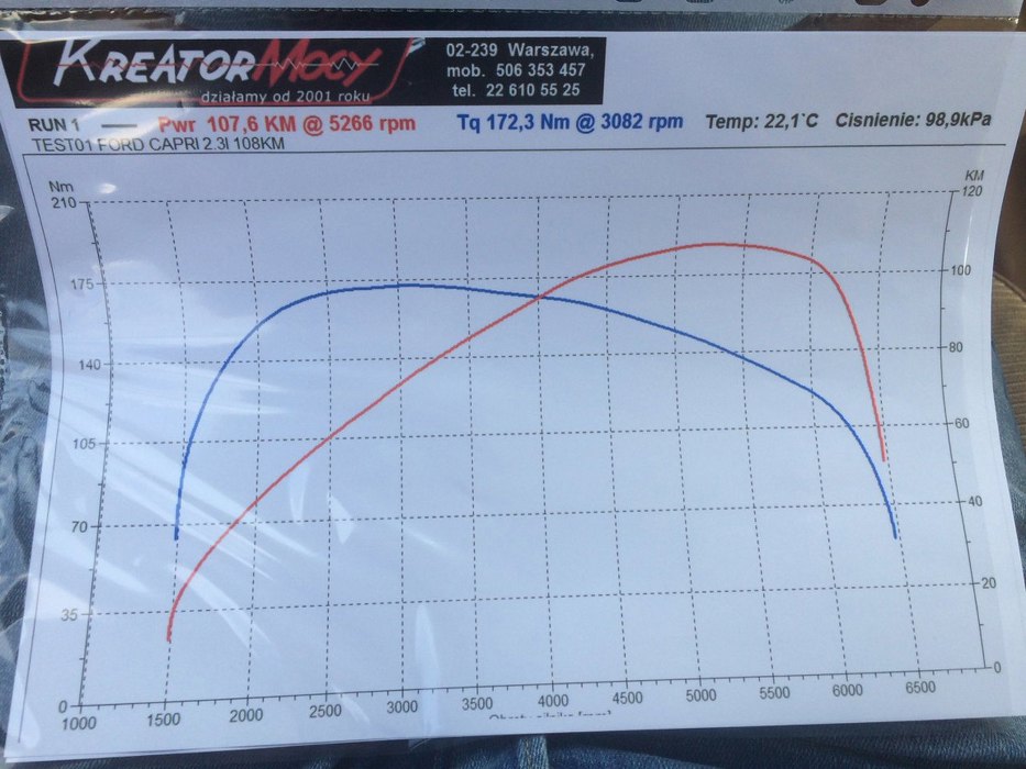 Tak, Capri było na hamowni. Bardzo mnie to interesowało ze względu na niewielkie poprawki, które zrobiłem w głowicach i kolektorze dolotowym. Wyszło nieźle, W/g fabryki silnik ten powinien mieć 108KM przy 5100 obr/min, co mniej więcej się zgadza z wykresem. Moment w/g katalogu powinien być 17.7 kgm przy 3000 obr/min, czyli prawie dobiliśmy do danych fabrycznych. Zatem zaryzykuję stwierdzenie, że dane katalogowe są optymistyczne, bo silnik gorszy niż wyjechał z fabryki to nie jest :).