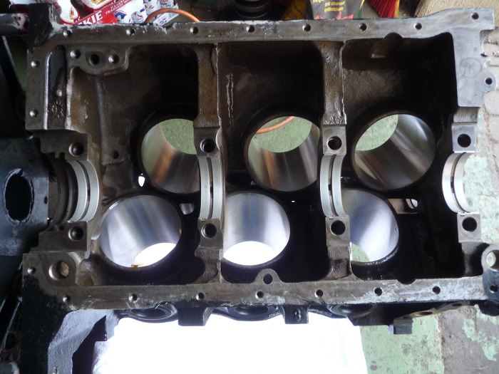 Po dniu otwartym stwierdziłem, że skoro i tak mam większość części przygotowaną, to poskładam chociaż dół silnika, żeby mniej miejsca zajmował. Poza tym po poskładaniu łatwiej jest dopilnować czystości - wystarczy zawinąć blok w folię strecz, zamiast kombinować nad każdą częścią z osobna. Dlatego powtórnie umyłem wnętrze silnika (z zewnątrz był już pomalowany) i posmarowałem je olejem, żeby nie korodowało. Następnie włożyłem panewki główne.