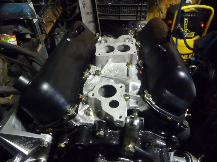 Następnie przykręciłem kolektor dolotowy i pokrywy zaworów. Widać też kawałek odnowionego mocowania alternatora.