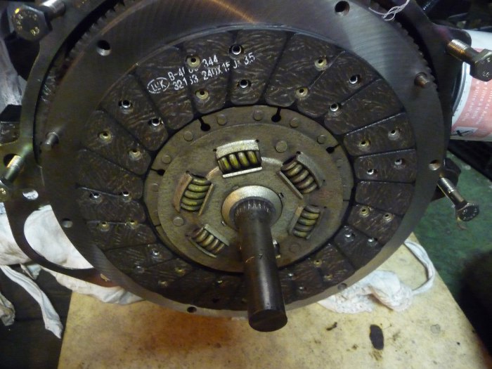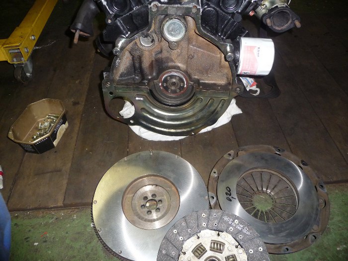 Przykręciłem koło zamachowe i użyłem skomplikowanego przyrządu (wałek ze starej skrzyni biegów) do ustawienia tarczy sprzęgła.
