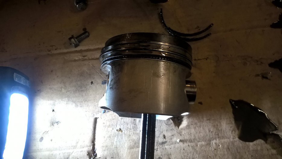 Pierwszy tłok wyjęty i od razu widać problem. Wysunął się sworzeń tłoka. To akurat ciężko przewidzieć, bo w tych silnikach sworznie są wciskane w gorący korbowód, po schłodzeniu korbowód zaciska się i sworzeń zostaje w miejscu. Musi być coś nie tak z korbowodem, żeby sworzeń się wysunął.