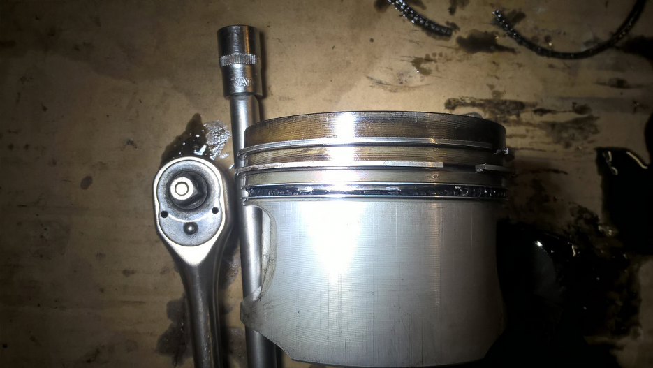 Tu kolejna awaria - sprężynka rozpierająca pierścienie olejowe nie siedzi na miejscu, a weszła w rowek olejowy w tłoku. Takiego czegoś jeszcze nie widziałem.
