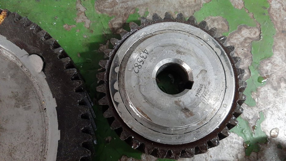 Tłoki i korbowody oczywiście też nie są do użycia - po takiej awarii nie można im zaufać. Ale dalej było jeszcze ciekawiej. Koła rozrządu są dziwne - wyglądają na dorabiane w środku, tylko zęby są z podobnego materiału co oryginał. Do tego miały wstawione kołki metalowe na granicy metalu z tworzywem - być może tworzywo się ruszało? Ale po wstawieniu kołków wszystko nadal się rusza - można poruszyć wieńcem w stounku do środka koła o 1mm w każdą stronę!
