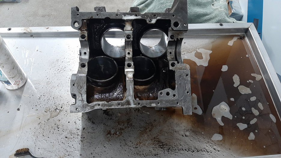 Z zewnątrz oczyściłem blok druciakiem na szlifierce i tak dalej. Potem blok trafił do myjki na domycie resztek starego szlamu olejowego ze środka. Oj, tu nie było łatwo.