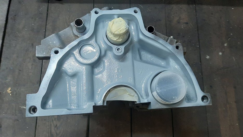 Po umyciu zakamarków bloku osuszyłem go i odtłuściłem. Po zabezpieczeniu wszystkiego co trzeba pomalowałem go podkładem. Nawet z tej strony co nie widać, no bo po co ma tu rdzewieć?