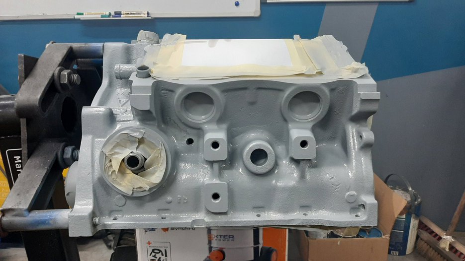 Blok oczywiście był z odzysku, więc trafił do szlifierni na obróbkę. Szlifowane były cylindry, planowane płaszczyzny pod głowice, sprawdzona osiowość stóp wału. Wał na szczęście nie ucierpiał od opiłków, wzięły je na siebie panewki. Założone zostały właściwe tłoki na korbowody, a cały układ korbowo-tłokowy został wyważony. Zaczynamy dalszą część prac.