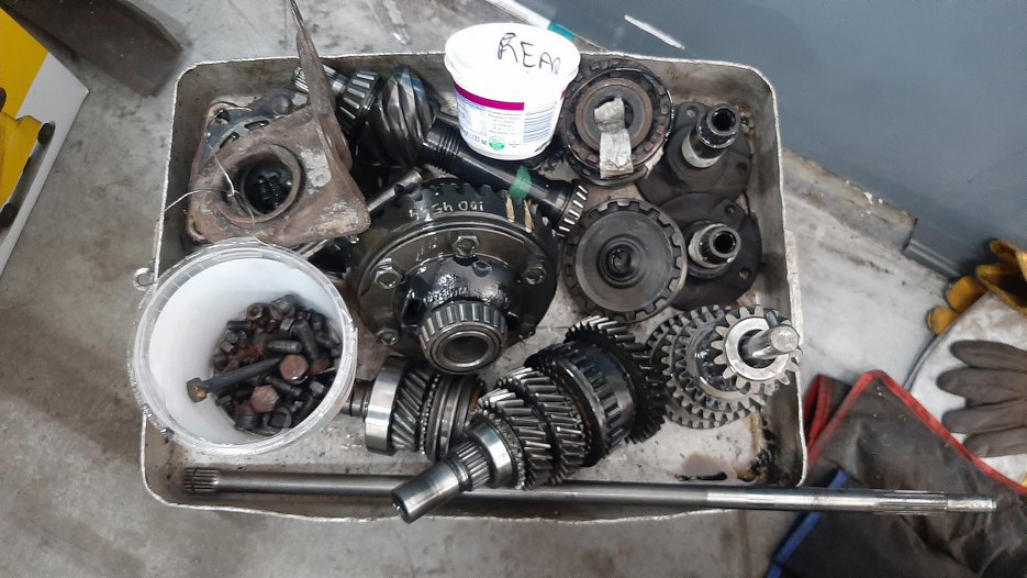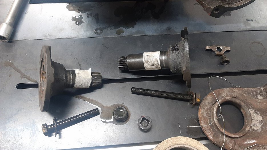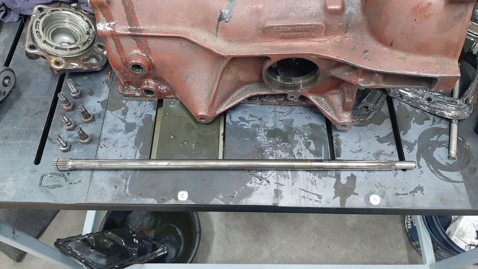 Ponieważ rozkładam taką skrzynię pierwszy raz w życiu, to mogę to robić dość chaotycznie. Dopóki nie używam szlifierki kątowej to wszystko jest jednak pod kontrolą :). Odkręciłem półosie. Lewa i prawa są różnej długości.