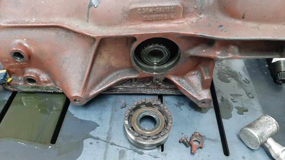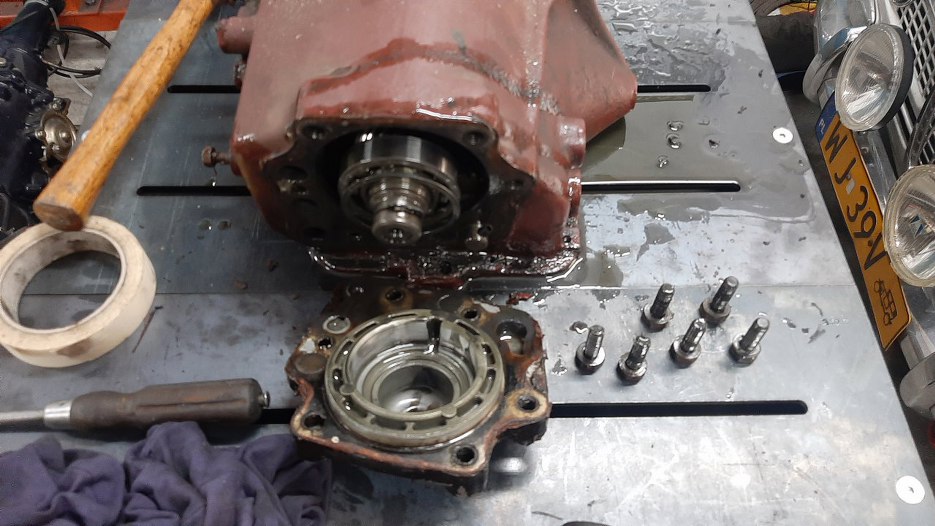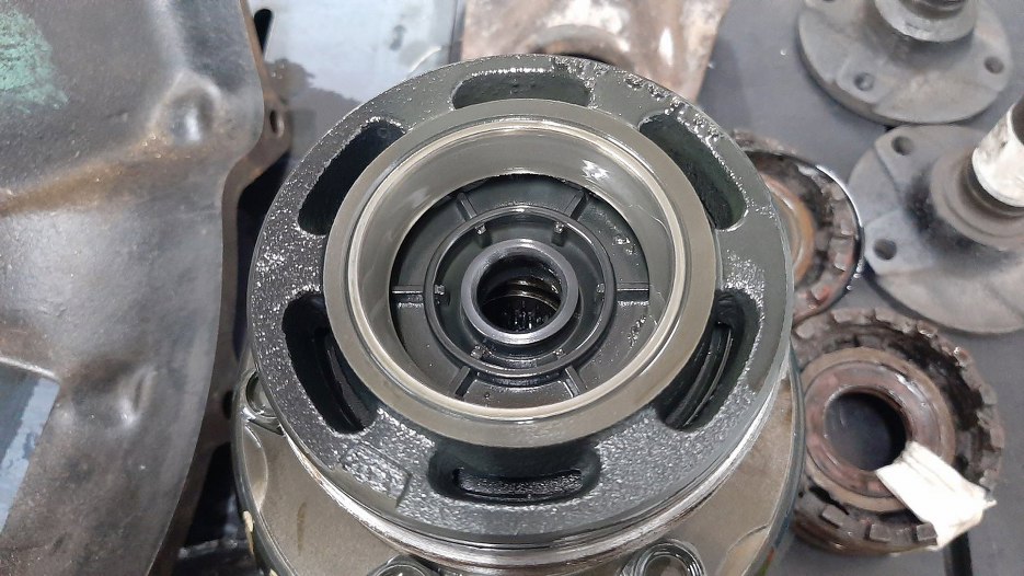 I tu trochę za wcześnie to odkręciłem. Powinienem zacząć od zdjęcia miski olejowej i zobaczenia co jest w środku i od czego zacząć. Ponieważ jednak olej wciąż się ze skrzyni sączył, a mi nie chciało się paprać, to odkręciłem te dziwne nakrętki, w których obsadzone były uszczelniacze półosi. Okazało się, że od wewnątrz są w nich bieżnie łożysk mechanizmu różnicowego, który teraz lata w skrzyni dość luźno :).