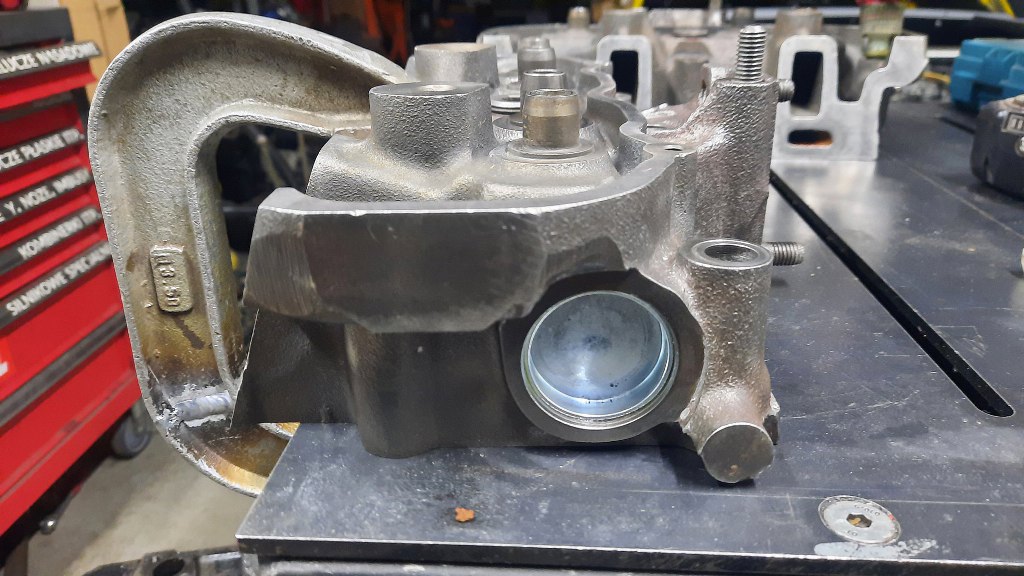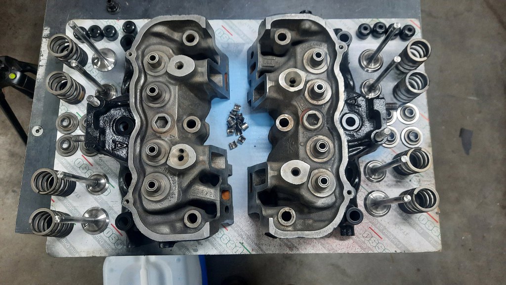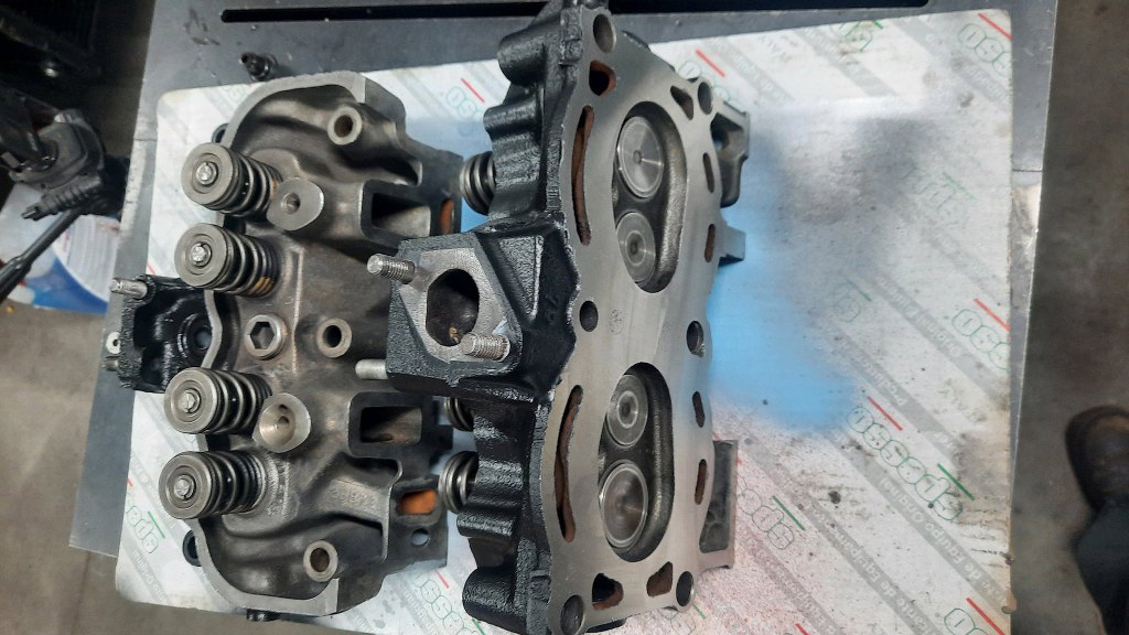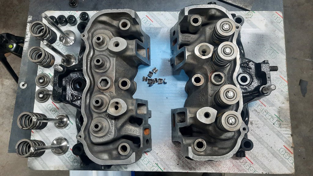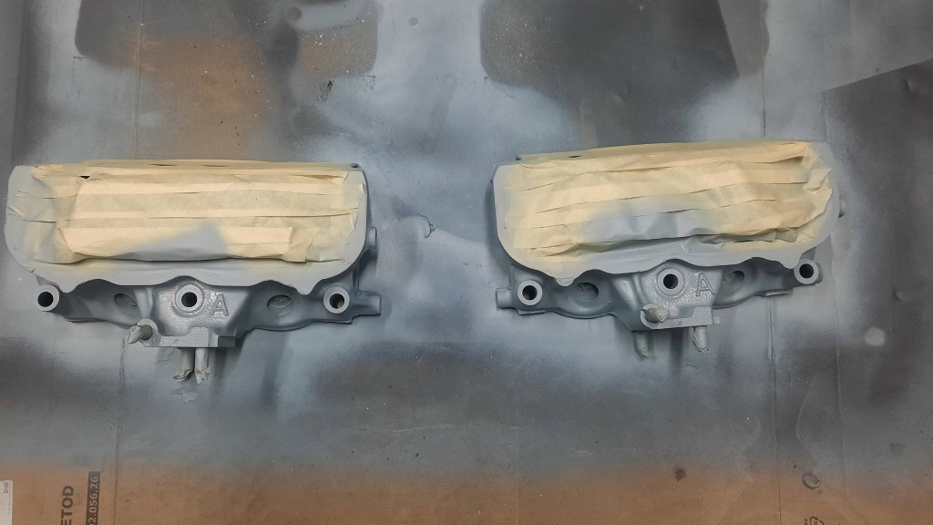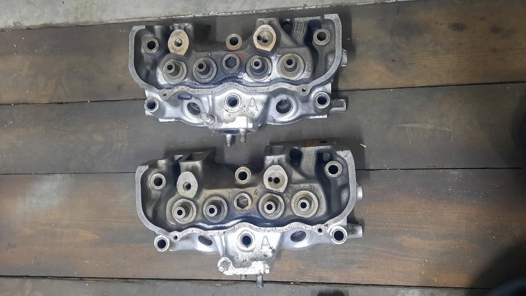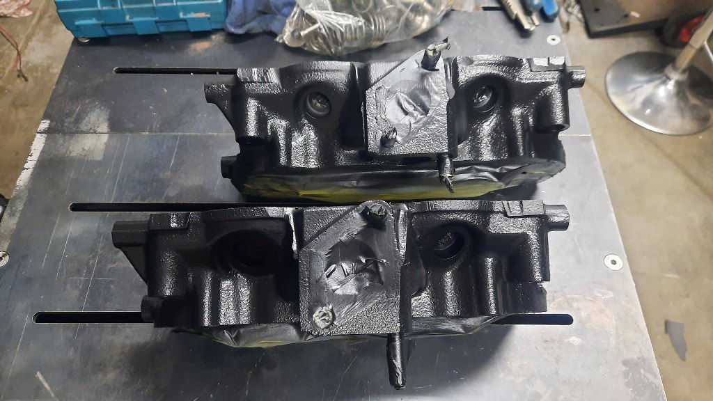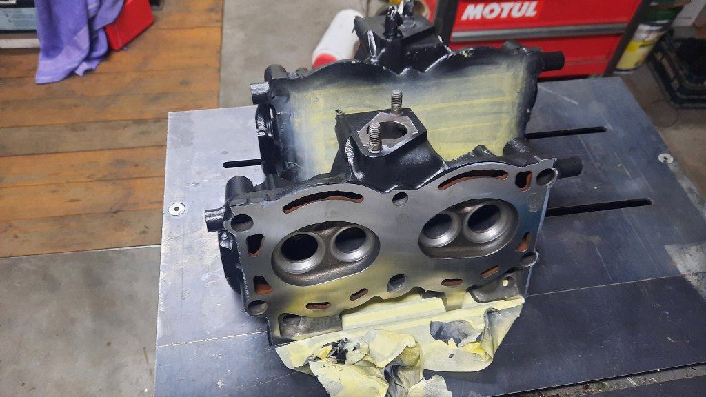 Skrzynia biegów zrobiona i czeka na samochód, wrócę zatem do silnika. Przy jakiejś okazji zawiozłem głowice do szlifierni do sprawdzenia. Głowice, które były przecież po remoncie, no bo silnik, z którego są, był po remoncie. Okazało się, że trzeba szlifować przylgnie zaworów, wstawić nowe prowadnice zaworowe, bo były luzy, planować, szlifować gniazda... Ciekawe. Przy okazji wstawione były twarde gniazda zaworowe. Tu już po powrocie ze szlifierni. Podoba mi się malowanie na srebrno :).