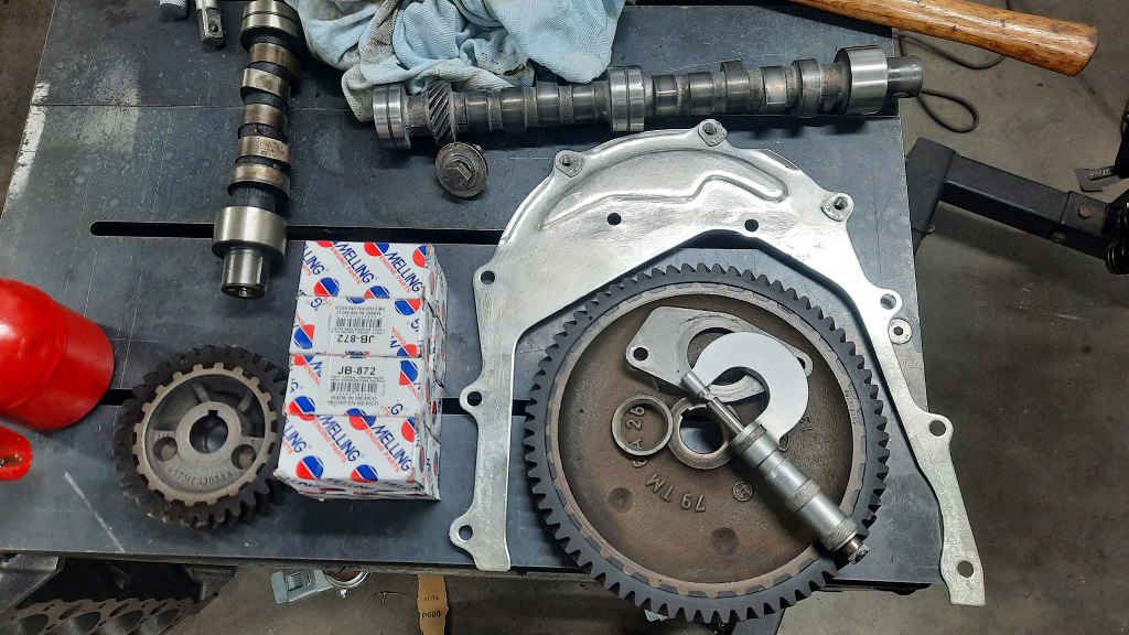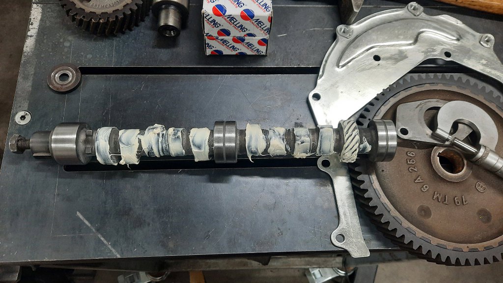 Żeby jednak założyć głowice, muszę włożyć popychacze zaworowe - po założeniu głowic nie ma do nich dostępu. Ale żeby włożyć popychacze, to musi być wałek rozrządu... No dobra, biorę się za rozrząd. Przygotowałem ile się dało. Część rzeczy dostarczył Włodek - właściciel Matry, ale zabrakło mi np. płytki mocującej wałek rozrządu w bloku i praktycznie wszystkich śrubek. Dostarczony przez niego wałek rozrządu i popychacze wyglądały w sumie nieźle, ale po dokładnych oględzinach niestety odpadły. Wałek nadaje się jeszcze do regeneracji, ale popychacze wywaliłem na złom.