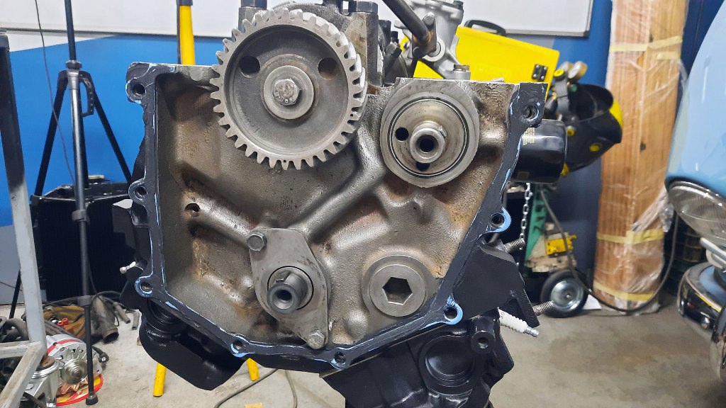 Pokrywy rozrządu nie mam jeszcze gotowej. Musi tu być taka bez łożyska wiatraka, bo Matra ma silnik z tyłu. Takiej nie mam. Właściciel dostarczył co prawda pokrywę, i to właściwą, ale jej nie będę docelowo zakładał - potem będzie zdjęcie, na którym widać dlaczego. Póki co muszę jednak coś przykręcić, żeby odpowiednio docisnąć uszczelkę pod blachą rozrządu.