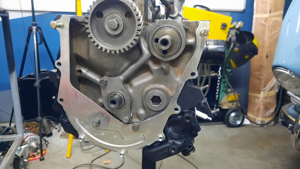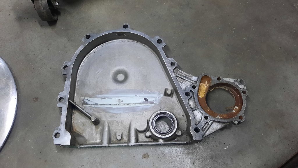 Przykręciłem tą pokrywę. Co ciekawe, jest to fabryczna część Forda, bez odlewu pod łożysko wiatraka chłodnicy.