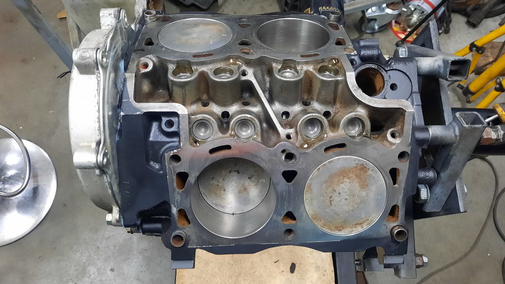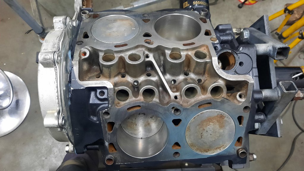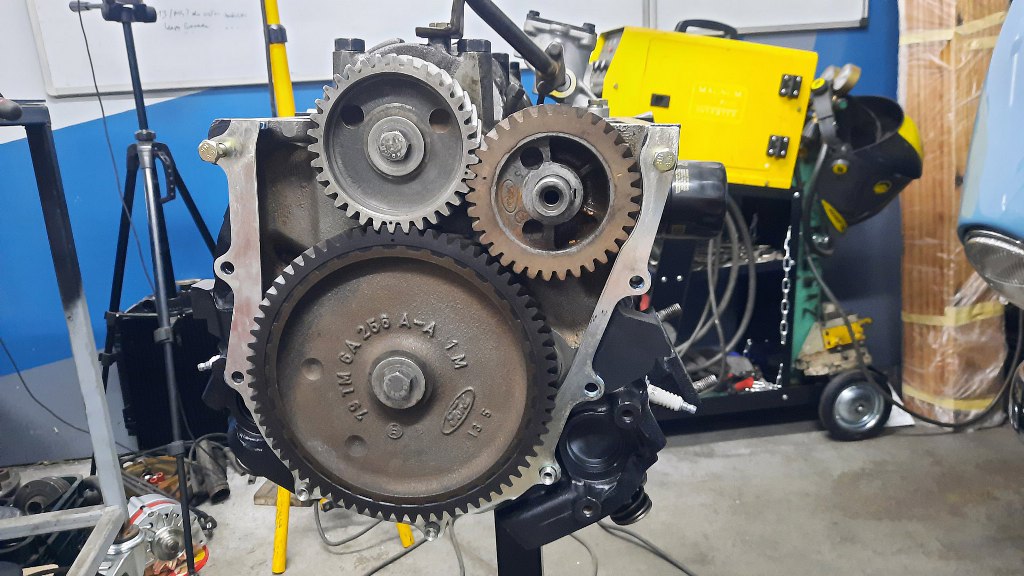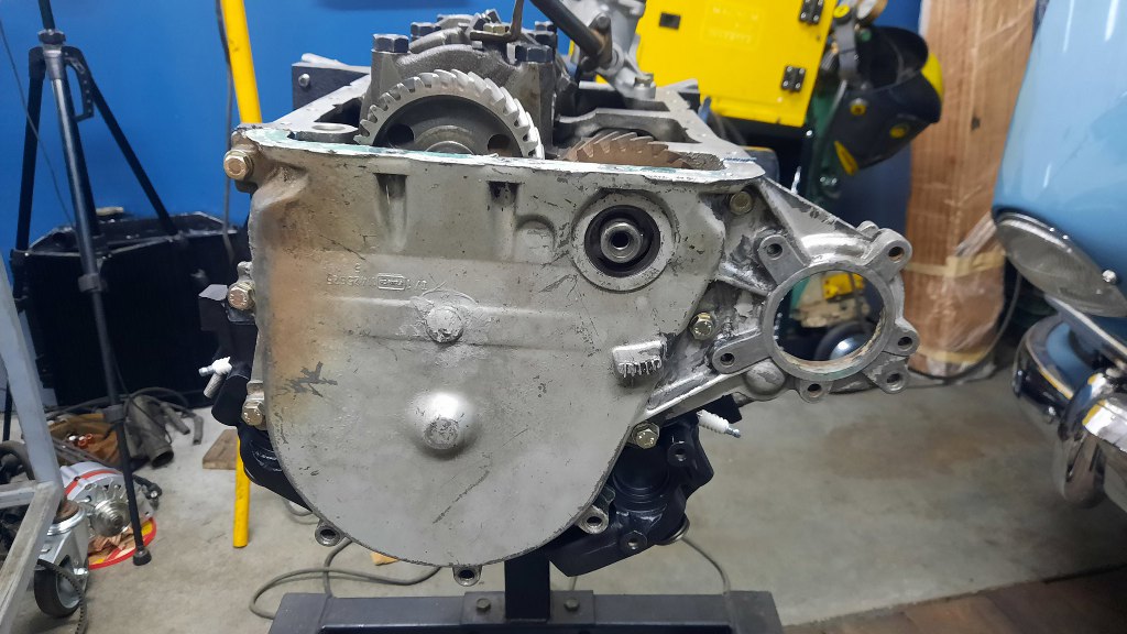 I tyle jestem w stanie na razie zrobić. Dźwigienek zaworowych mam tylko jeden dobry komplet pozyskany ze starego silnika, więc góry jeszcze nie złożę. Pokrywa rozrządu, miska oleju, kolektor dolotowy i osprzęt pozyskane będą z silnika, który jest obecnie w Matrze. Pokrywa... tu widać dlaczego tej nie chcę użyć. Ktoś ją kiedyś spawał i to w dość nieładny sposób. Tyle że... znalazłem zdjęcia tej pokrywy, która była na tym silniku, a obecnie jest w Matrze, czyli ją będę miał do dyspozycji. I tam chyba jest pokrywa z odlewem pod łożysko wiatraka, odciętym i zaspawanym. Ale zaspawanym podobnie jek tu. Ech. Czyli albo tą ładnie muszę oszlifować, żeby nie było widać, że była spawana, albo przerobić tamtą.